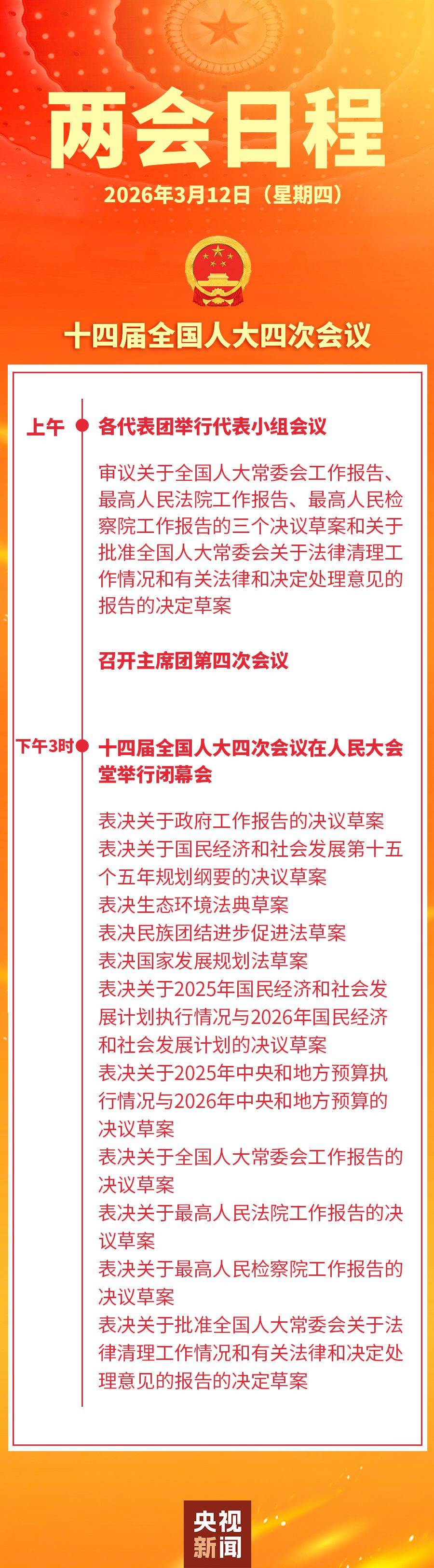 12日下午3时,十四届全国人大四次会议在人民大会堂举行闭幕会,表决关于政府工作报告的决议草案,表决关于国民经济和社会发展第十五个五年规划纲要的决议草案,表决生态环境法典草案,表决民族团结进步促进法草案,表决国家发展规划法草案,表决关于2025年国民经济和社会发展计划执行情况与2026年国民经济和社会发展计划的决议草案,表决关于2025年中央和地方预算执行情况与2026年中央和地方预算的决议草案,表决关于全国人大常委会工作报告的决议草案,表决关于最高人民法院工作报告的决议草案,表决关于最高人民检察院工作报告的决议草案,表决关于批准全国人大常委会关于法律清理工作情况和有关法律和决定处理意见的报告的决定草案。