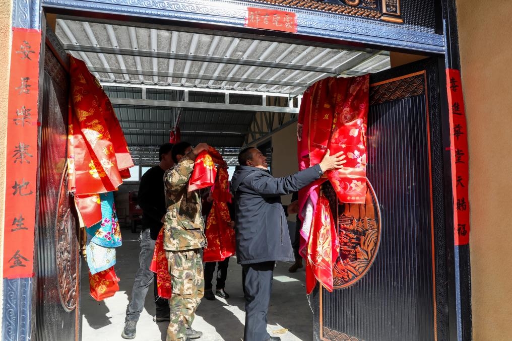 1月15日,在天祝藏族自治县哈溪镇水泉村生态及地质灾害避险搬迁安置点,村民将红色被面挂在新搬迁户的大门上表达祝福。