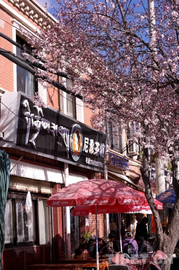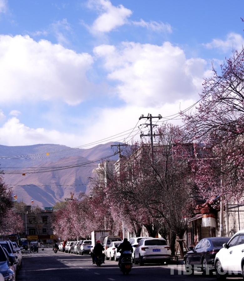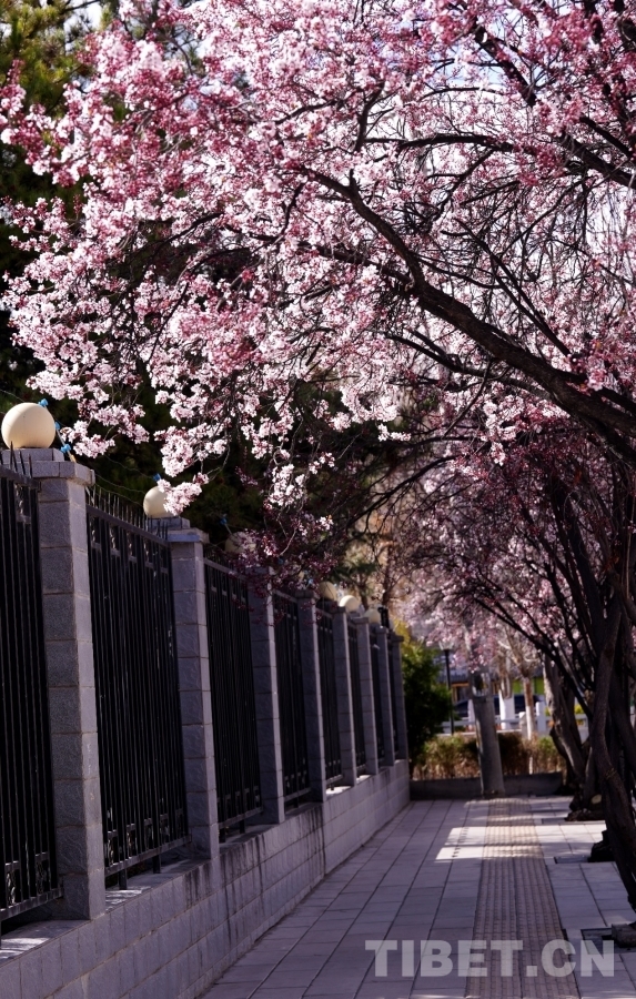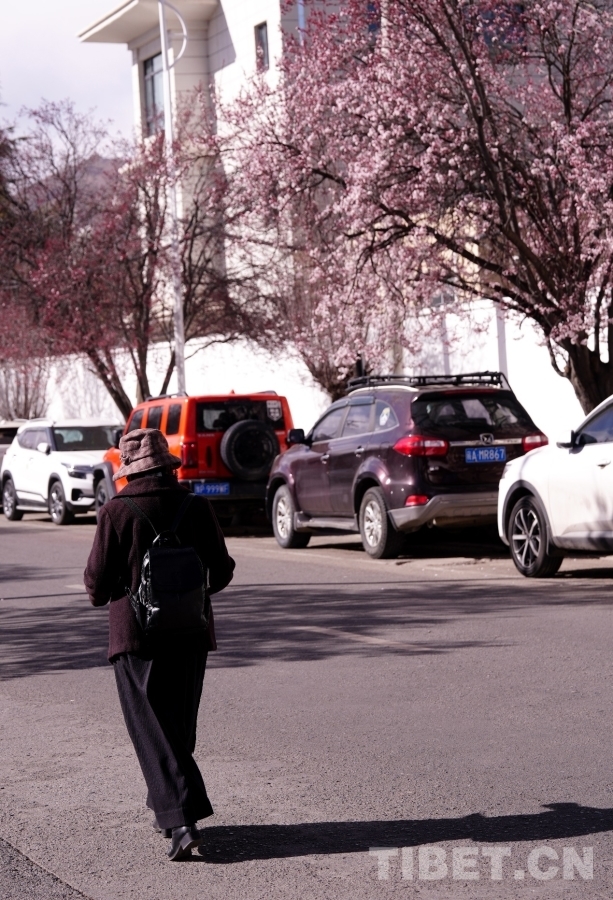 放眼望去,一树树春花争相绽放,在春日的暖阳下显得格外耀眼夺目。在这条被春花装扮一新的街道上,随处可见市民悠然自得的身影——有人漫步行走在花间道路,沉醉于满目春色;有人静坐在茶馆门外的桃花树下,一边品味甜茶的醇香,一边享受春日的惬意时光。花影、人影与街景交相辉映,处处洋溢着春日拉萨的生机与浪漫。