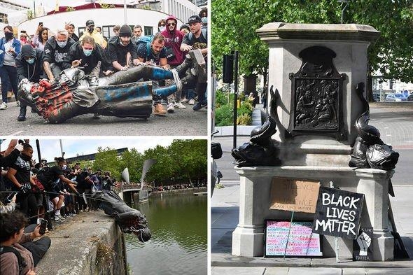 在英国港口城市布里斯托尔,17世纪奴隶贩子爱德华·科尔斯顿的雕像被示威者拆毁并投入河中,在雕像原底座下放置了“黑人的命也重要”的标语牌。图:美国雅虎新闻网站