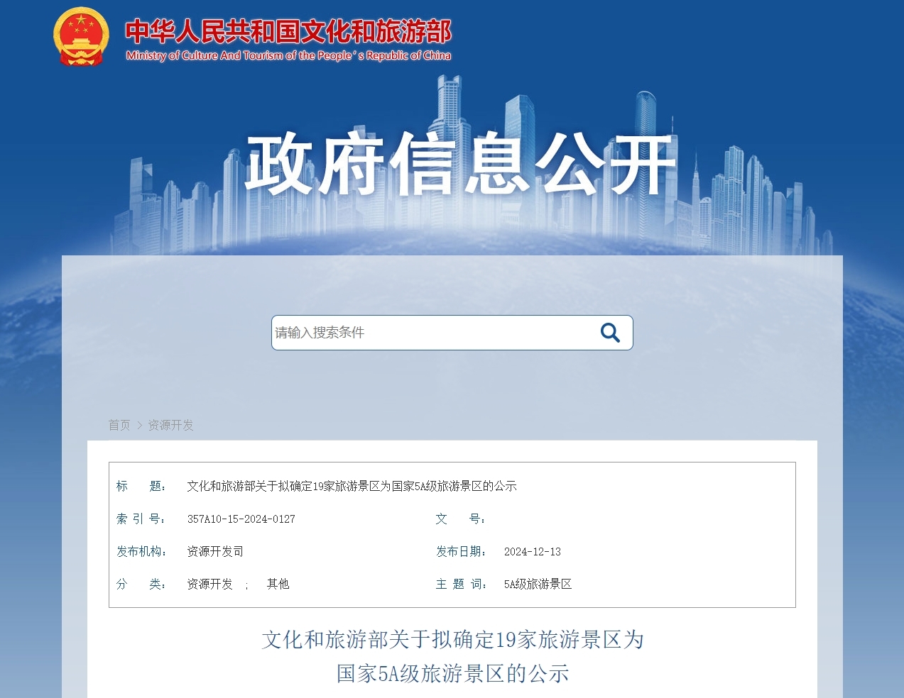 根据中华人民共和国国家标准《旅游景区质量等级的划分与评定》和《旅游景区质量等级管理办法》,经有关省(区、市)文化和旅游行政部门推荐,文化和旅游部按程序组织综合评定,以下19家旅游景区达到国家5A级旅游景区标准要求,拟确定为国家5A级旅游景区,现予以公示。名单如下: