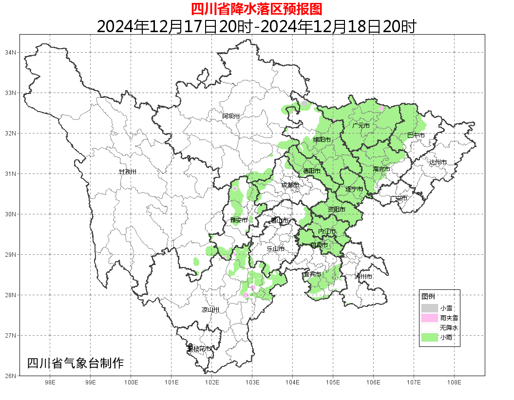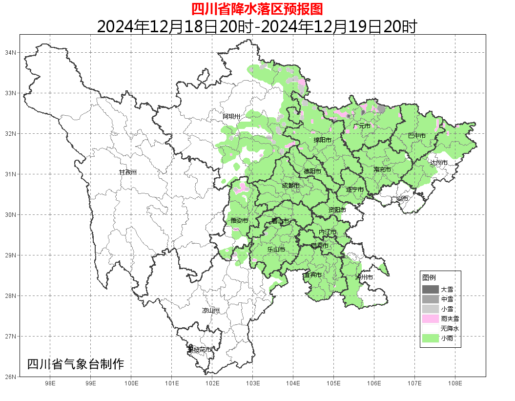 18日晚上到19日白天:盆地各市阴天有小雨或零星小雨,高海拔山区有雨夹雪或小雪;阿坝州北部东部多云间阴天有分散阵雪(雨),川西高原和攀西地区其余地方晴间多云。