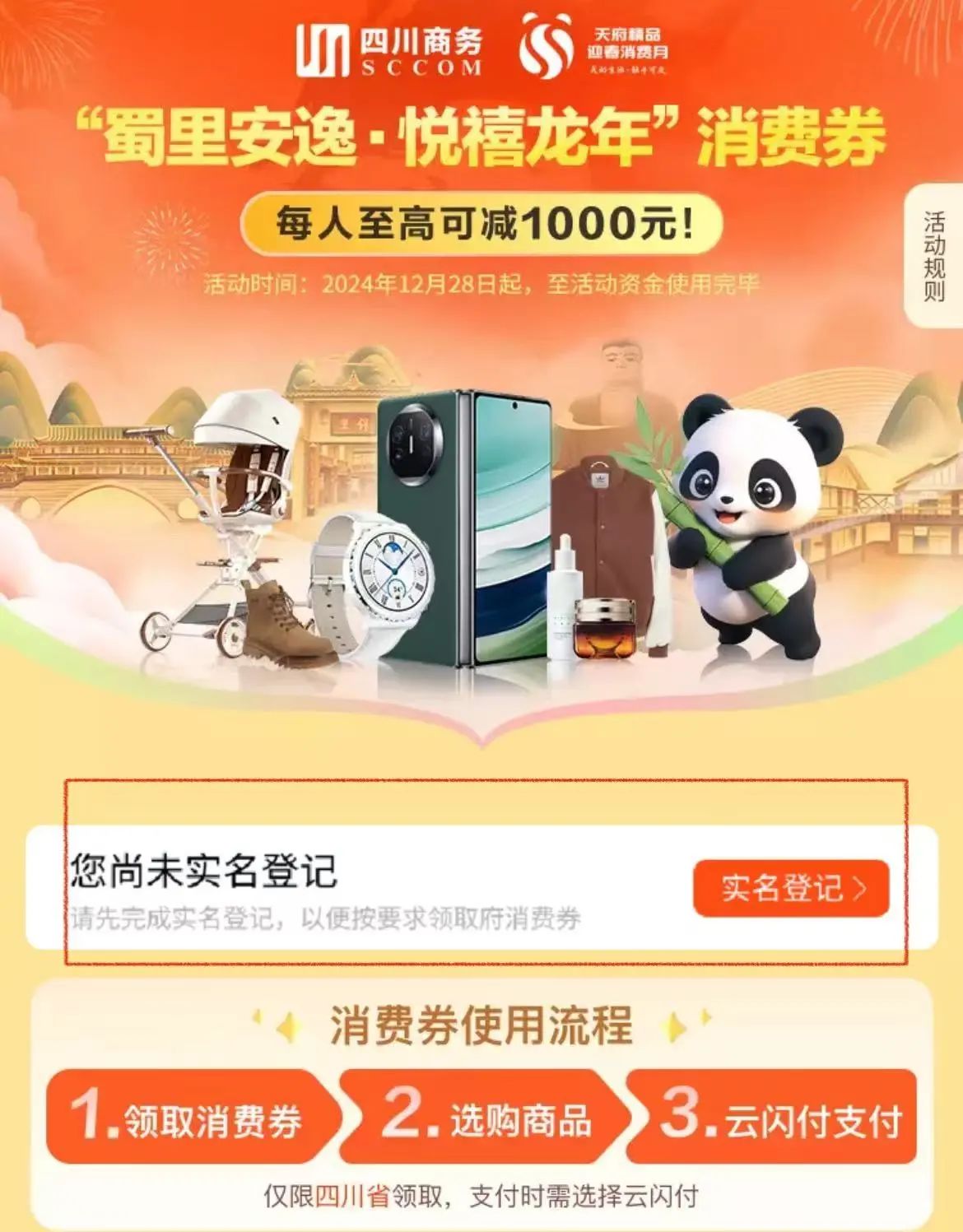 手机定位在四川的消费者可在唯品会App首页点击【政府补贴】专栏,点击【蜀里安逸悦禧龙年(四川可领)】图标;或在唯品会App首页搜索【蜀里安逸】【悦禧龙年】【四川消费券】等关键词,进入活动专区,完成实名登记,领取消费券。