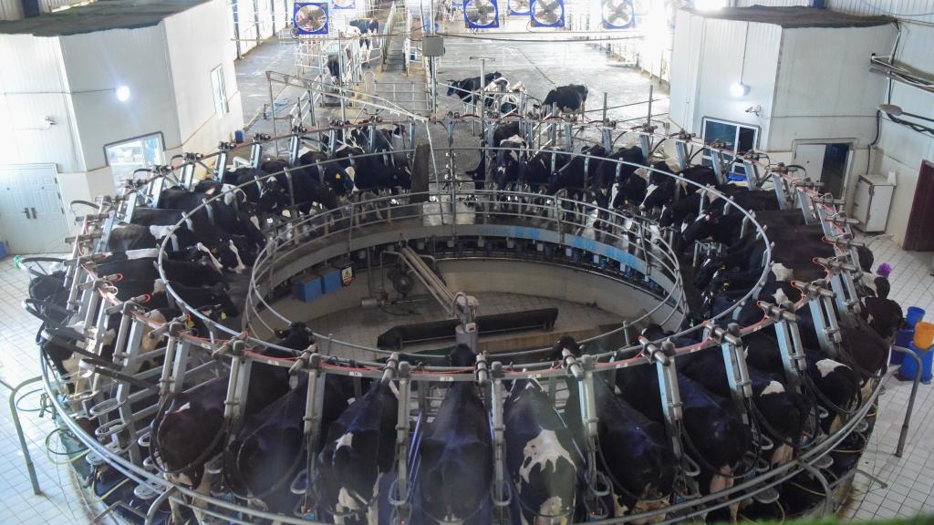 这是在新疆天润乳业股份有限公司丝路云端牧场拍摄的智能转盘式挤奶厅(2020年5月26日摄)。新华社记者 丁磊 摄