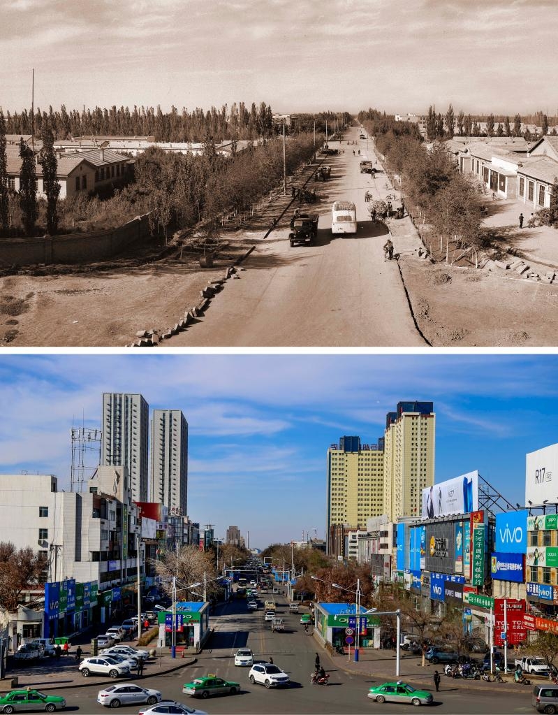 拼版照片:上图为上世纪50年代初期的石河子新城街道北子午路(新疆兵团农垦博物馆提供)。下图为2019年4月9日拍摄的同路段街景。新华社记者 王菲 摄