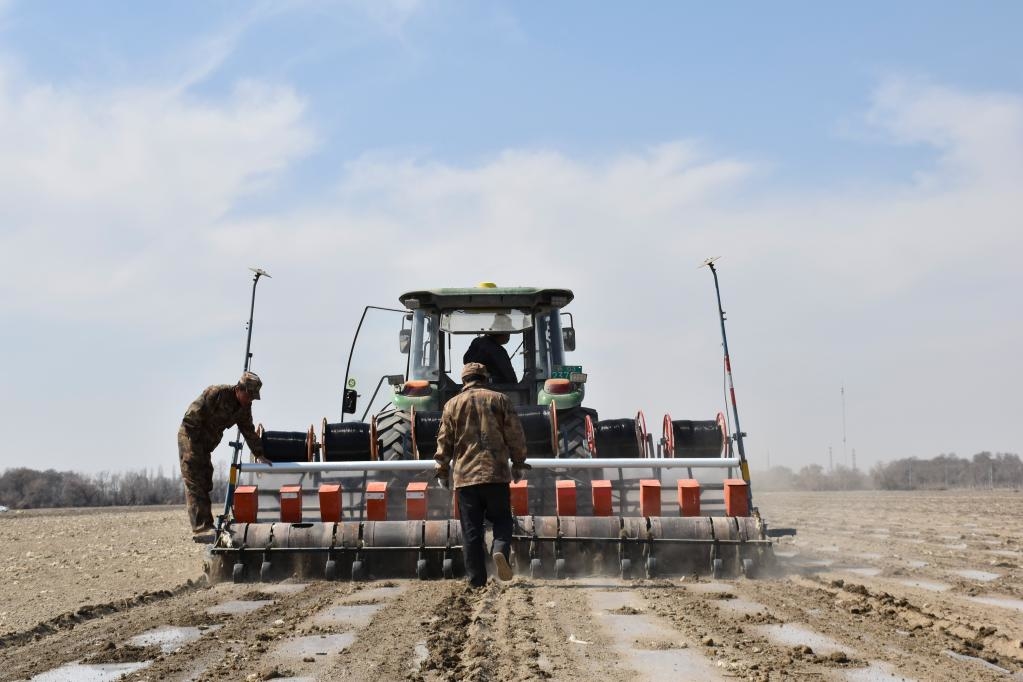 兵团职工朱勇强(中)在辣椒播种机后查看播种效果(2020年3月28日摄)。新华社记者 高晗 摄