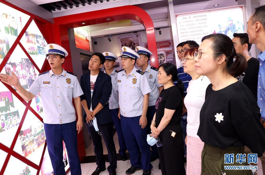 6月16日,上海市天山消防站消防员和共建单位员工在消防站荣誉室参观学习。