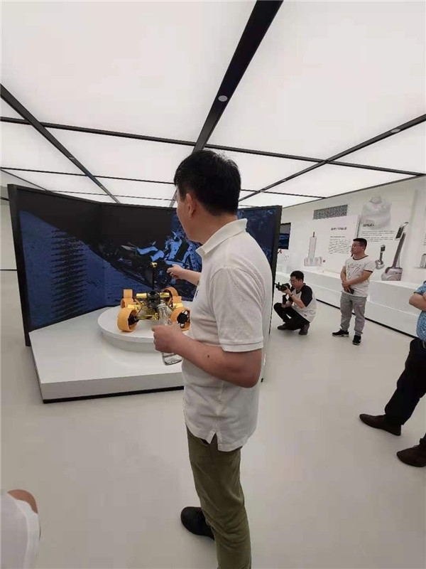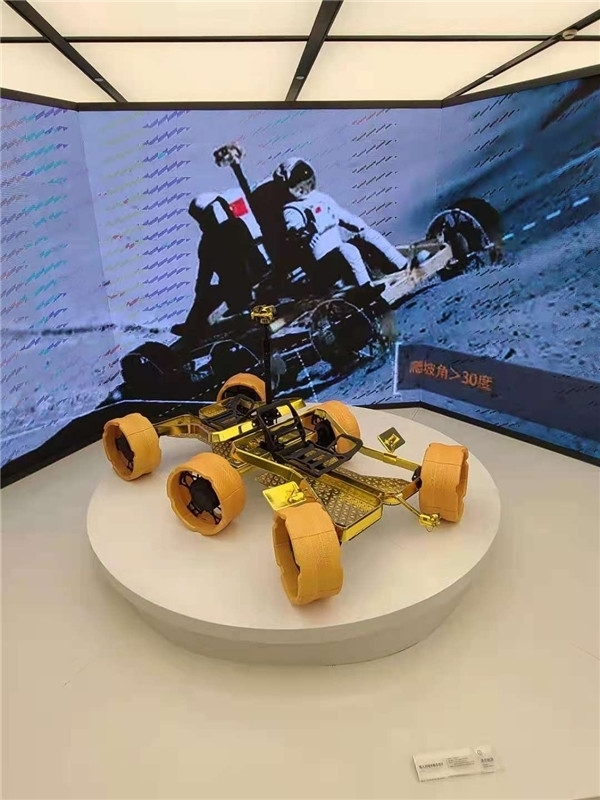 眼前的展台上,出现了一个浑身橙色和金色交织的6轮交通工具。背后的球形大屏幕上,是这个交通工具在月球上行走、漫游的画面——两名宇航员背靠背坐着,目视前方,巡游般地驱驰。
