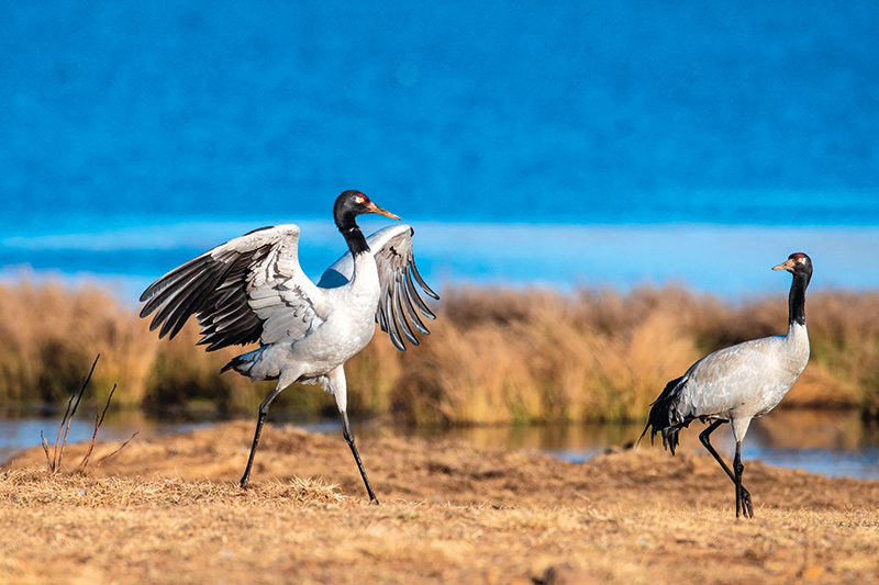2月24日,黑颈鹤在云南省昭通市大山包大海子湿地嬉戏。新华社记者 胡超 摄