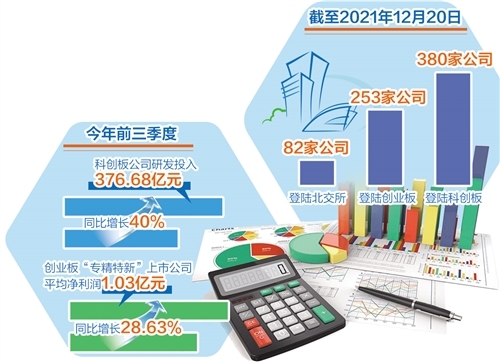 科创板支持与鼓励一大批“硬科技”企业上市发展、做优做强,助力企业“轻装上阵”。今年前三季度,科创板公司研发投入合计376.68亿元,同比增长40%,接近2020年全年水平。创业板积极服务高新技术企业、成长型创新创业企业。今年前三季度,创业板138家“专精特新”上市公司平均营业收入7.63亿元,同比增长35.53%;平均净利润1.03亿元,同比增长28.63%。北交所聚焦“更早、更小、更新”,着力打造服务创新型中小企业主阵地。81家首批上市企业中,有16家为“小巨人”企业,50%以上是“专精特新”中小企业。