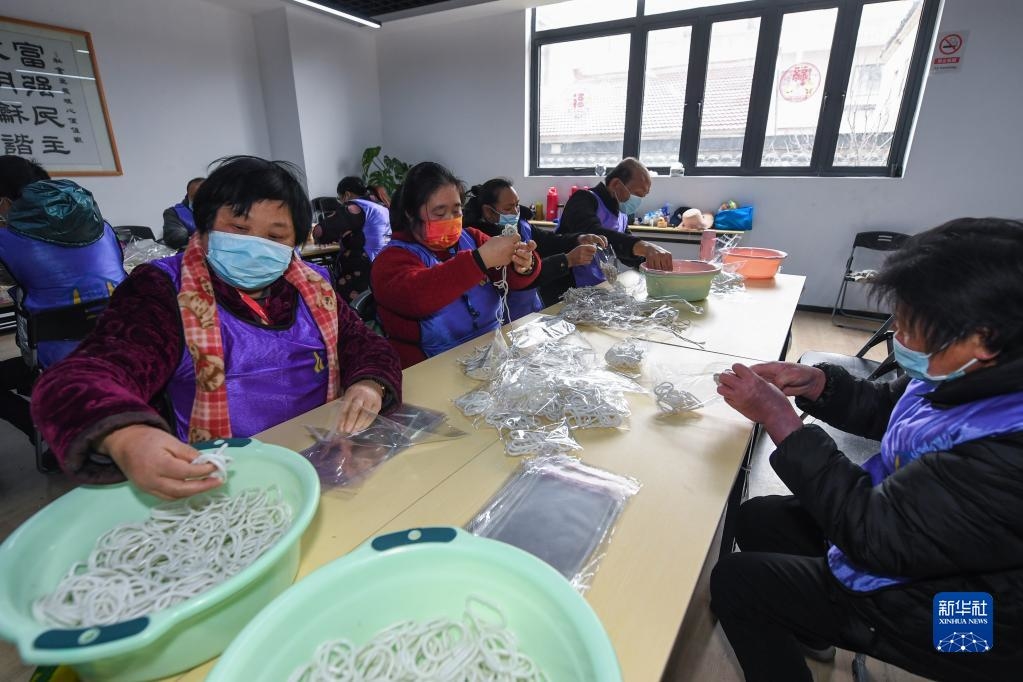 在浙江湖州市织里镇港西村残疾人之家,来自周边的残疾人正在打包配件(2022年2月22日摄)。完成工作后,他们可以获得相应报酬和补贴。新华社记者 徐昱 摄