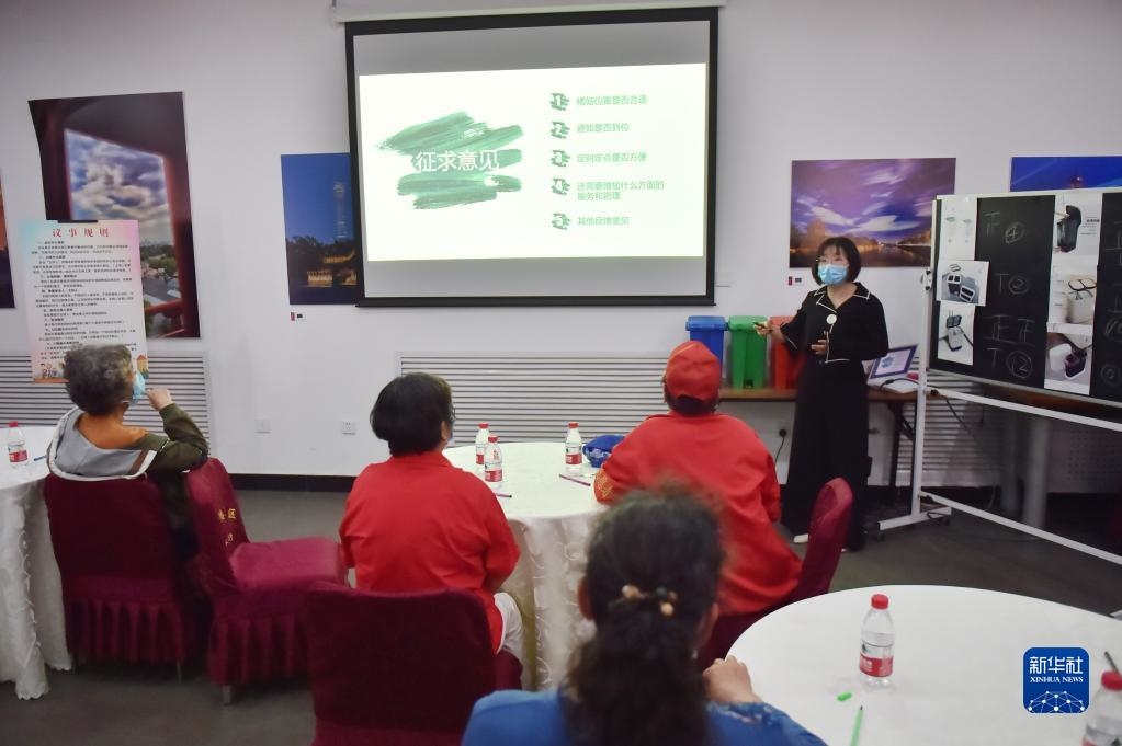 在北京建国门街道赵家楼社区议事厅举行的“两桶一袋”居民征求意见恳谈会上,来自社区的12位垃圾分类达人对“两桶”款式进行投票选择,同时,街道针对桶站位置、定时定点投放等垃圾分类运营管理听取居民意见(2020年5月2日摄)。新华社记者 彭子洋 摄