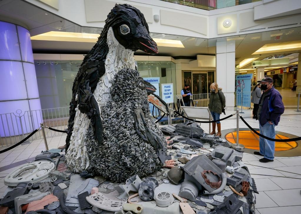 这是2月23日在加拿大伯纳比举行的“冲上海岸”艺术展上的参展作品。展览上的作品由从海洋中收集的塑料垃圾制成,意在宣传减少海洋塑料垃圾的重要性。新华社发(梁森摄)