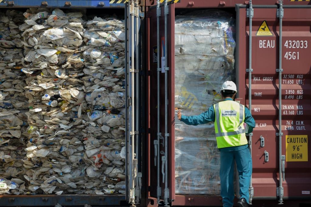 2019年5月28日,马来西亚能源、科技、气候变化与环境部工作人员在巴生港展示塑料废物。马政府此前在巴生港查获一批申报作假的洋垃圾,这些垃圾来自美国、加拿大和日本等国。新华社发(张纹综摄)
