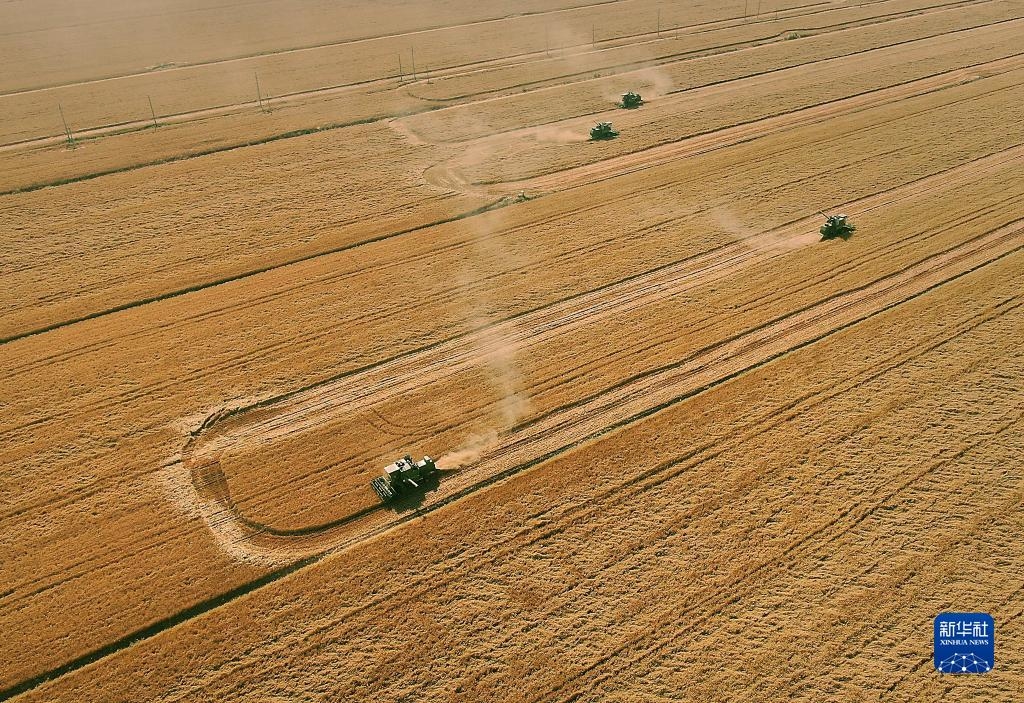 在河南省黄泛区农场九分场的麦田里,农机手操作收割机收获小麦(2021年6月6日摄,无人机照片)。新华社记者 李安 摄