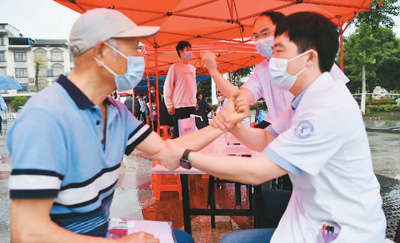 5月29日,湖北省卫健委带领10名由历届省健康科普大赛获奖选手组成的健康科普达人团队,开展“健康进万家 名医走基层——健康科普达人走进通城”活动,为当地医务工作者和群众开展健康科普巡讲和健康义诊。图为湖北省咸宁市通城县雁塔广场义诊活动现场。刘建平摄(人民视觉)