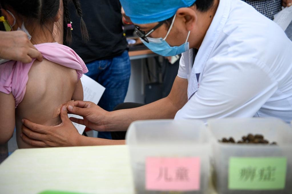 2021年7月11日,宁夏中医医院暨中医研究院治未病中心医师在为小朋友贴三伏贴。新华社记者 冯开华 摄