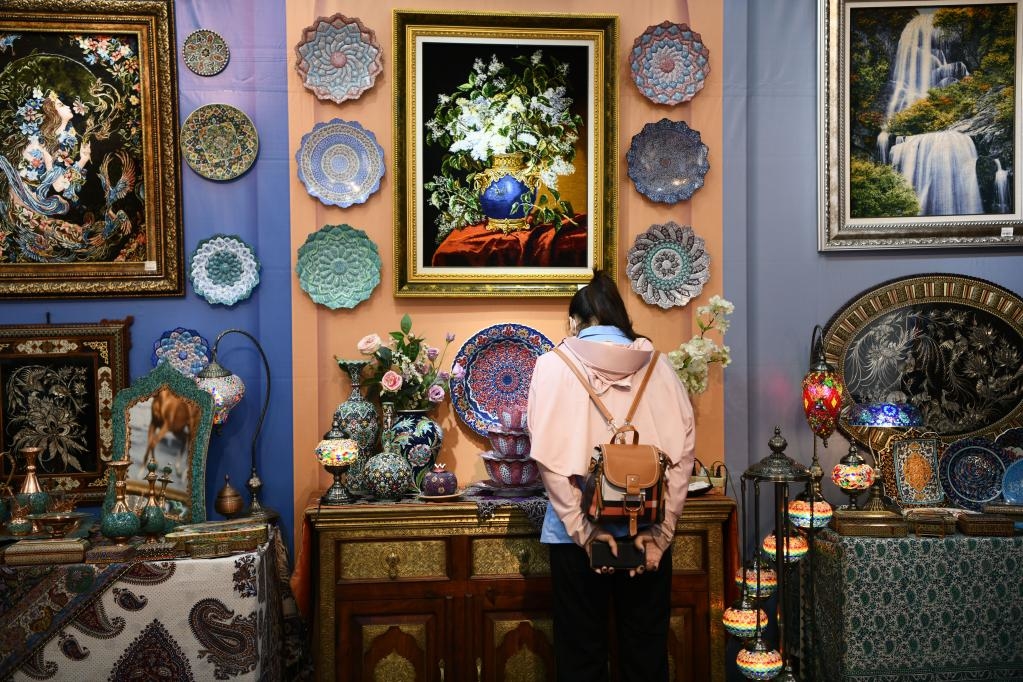 2021年9月12日,在广西南宁国际会展中心,参观者在东博会“一带一路”国际展区伊朗展台观看展品。