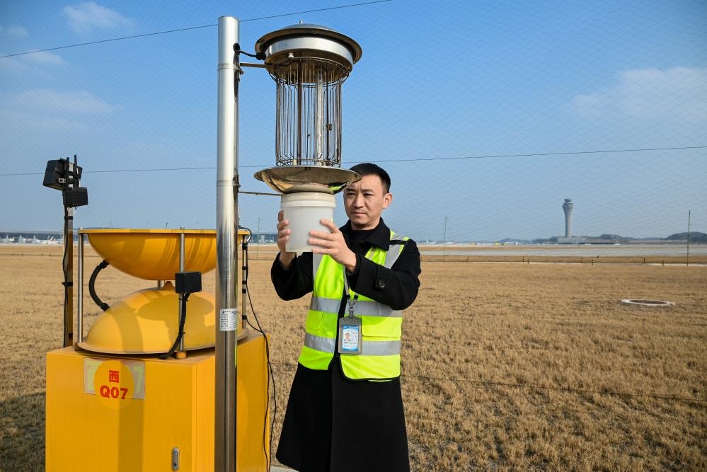 在成都天府国际机场,飞行区管理中心生态围界管理室主管刘泰杉在维护驱鸟设施。(受访者供图)