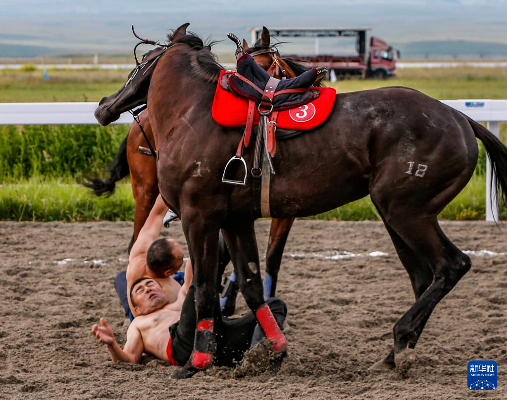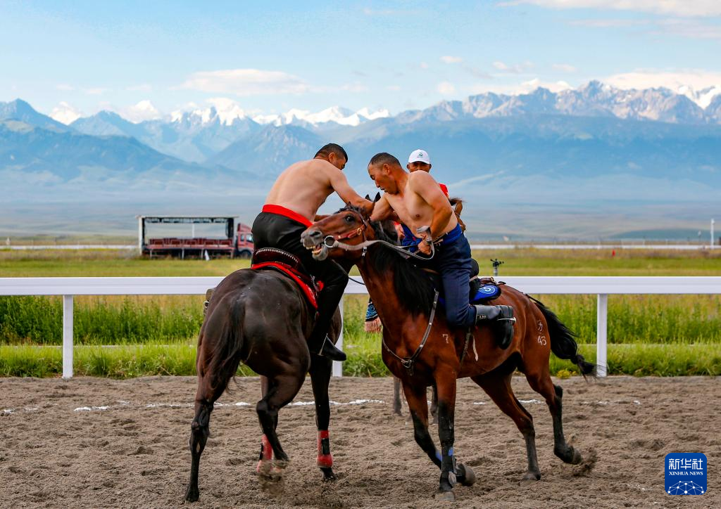 7月10日,新疆代表团运动员参加表演项目竞技类马上角力80公斤组别比赛。新华社记者 陈朔 摄