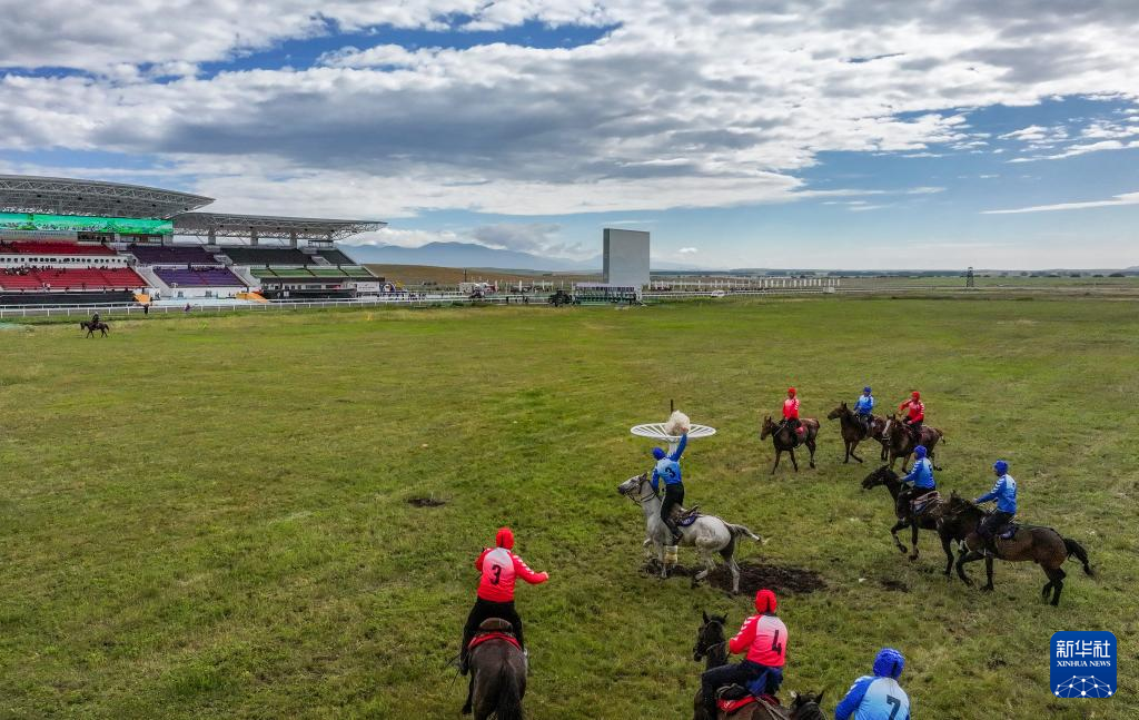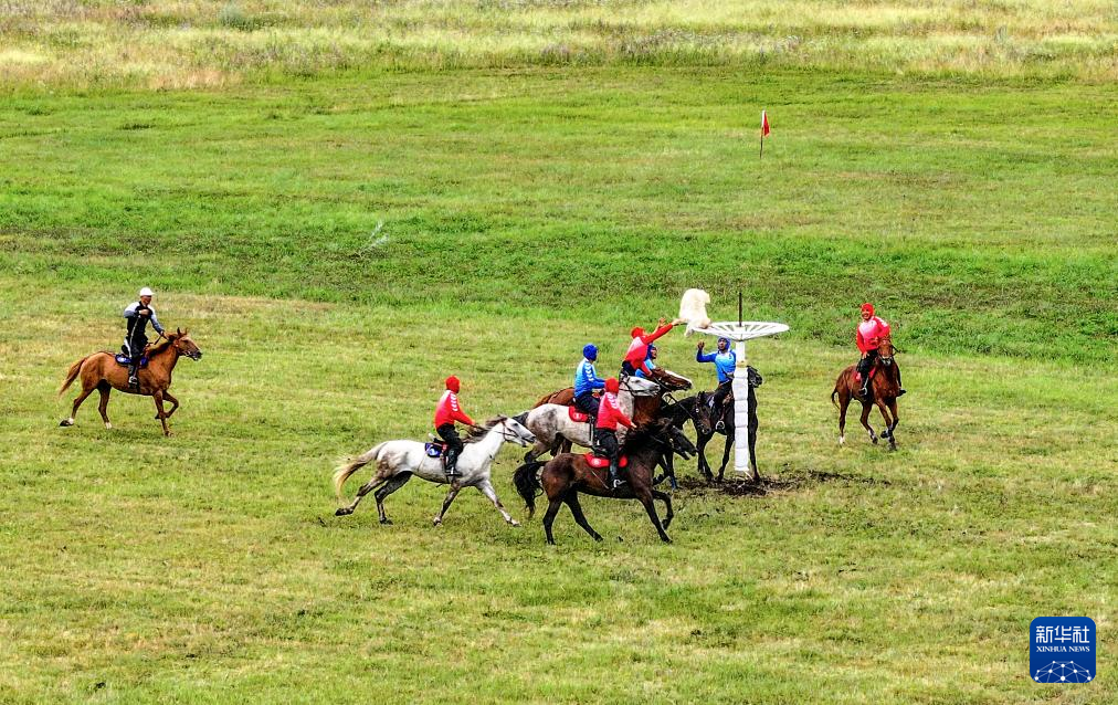 7月10日,新疆代表团运动员参加表演项目竞技类叼羊比赛(无人机照片)。新华社记者 陈朔 摄