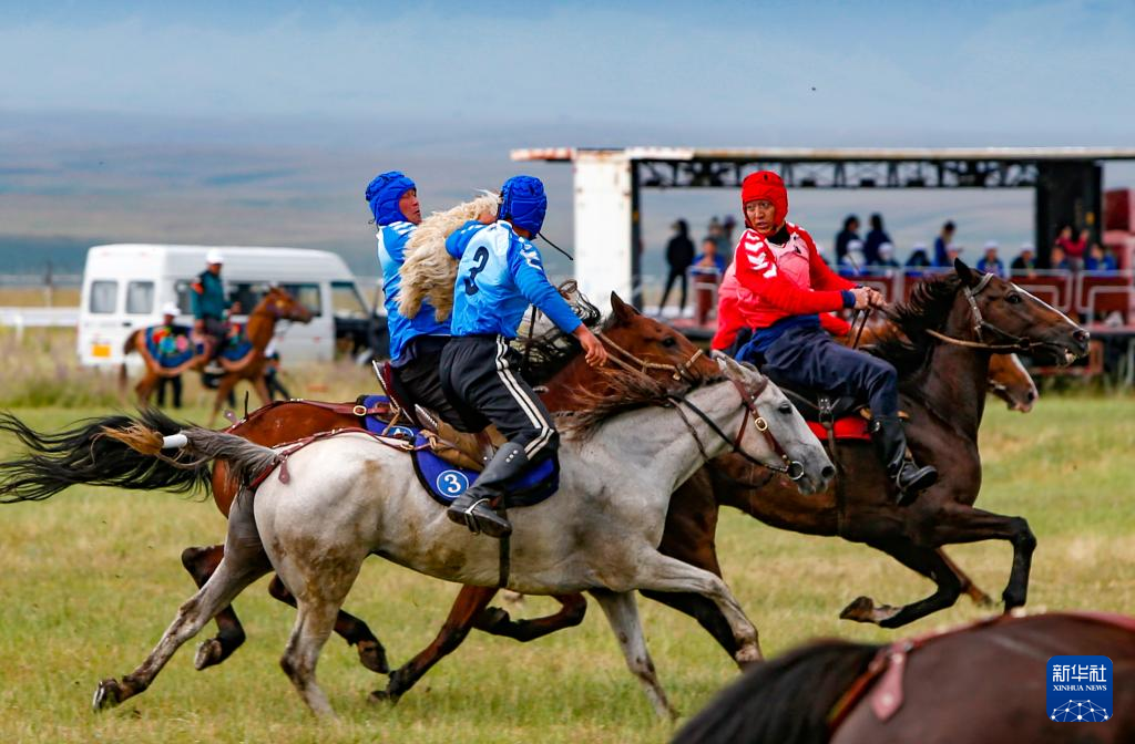 7月10日,新疆代表团运动员参加表演项目竞技类马上角力70公斤组别比赛。蓝方运动员将红方运动员拉下马得分。新华社记者 陈朔 摄