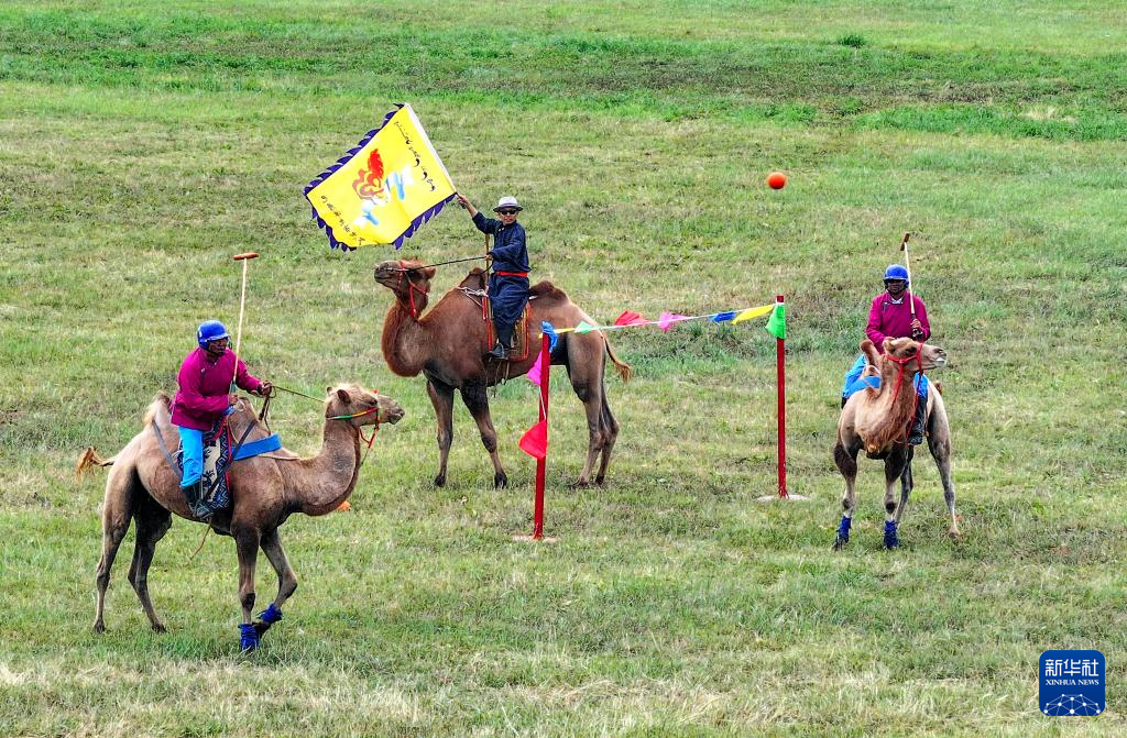 7月10日,内蒙古代表团运动员参加表演项目竞技类驼球比赛(无人机照片)。新华社记者 陈朔 摄