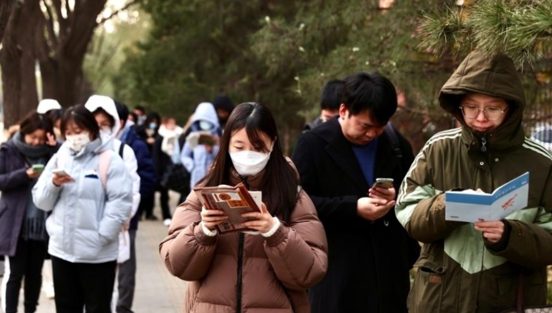 2023年11月26日,北京第十二中学校本部考点外,考生在入场前复习。当日,中央机关及其直属机构2024年度考试录用公务员公共科目笔试举行。中新社记者易海菲摄