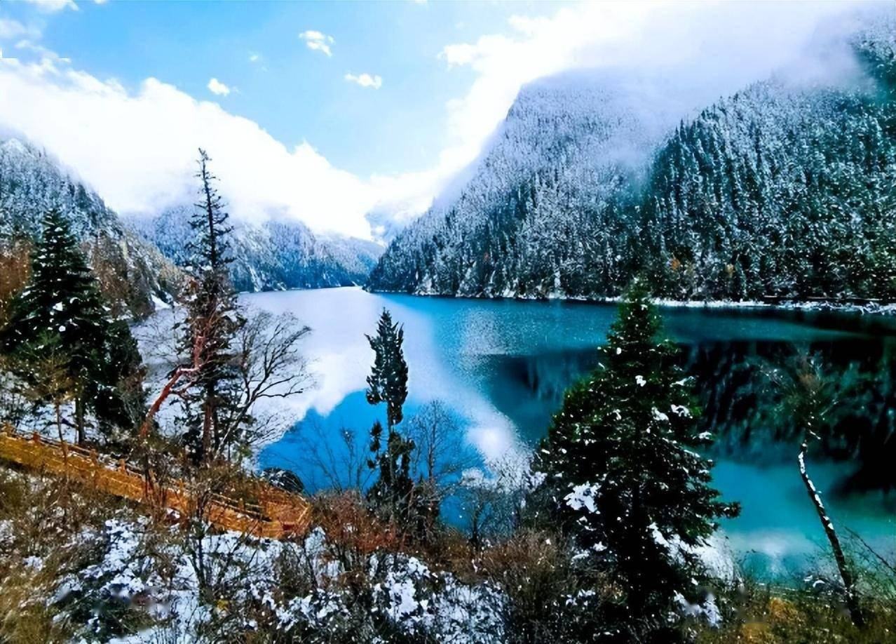 立冬时节,四川各地景色如画。九寨沟被白雪覆盖,海子的碧蓝与雪的纯白相呼应,四周白茫茫一片,仿佛时间静止。