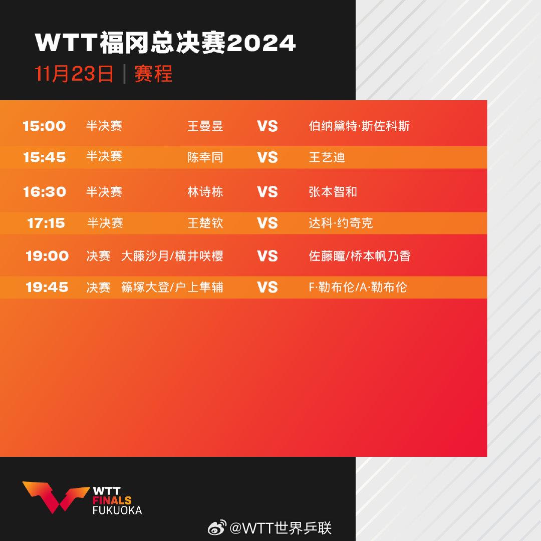 11月23日,WTT福冈总决赛继续进行。赛程如下↓↓