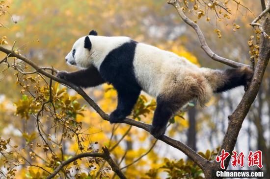 近日,在陕西省汉中市佛坪县的秦岭大熊猫佛坪救护繁育研究基地内,大熊猫惬意地散步、玩水、爬树、吃竹子,憨态可掬的模样吸引了不少游人驻足欣赏。据悉,佛坪县地处秦岭腹地,森林覆盖率达92%,这里生活着137只大熊猫。图为大熊猫爬树。
