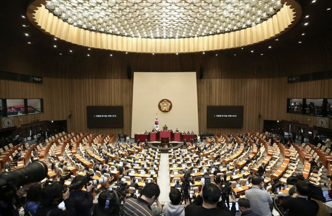 12月14日,在韩国首都首尔,韩国国会议员参加弹劾动议案投票。新华社记者姚琪琳摄