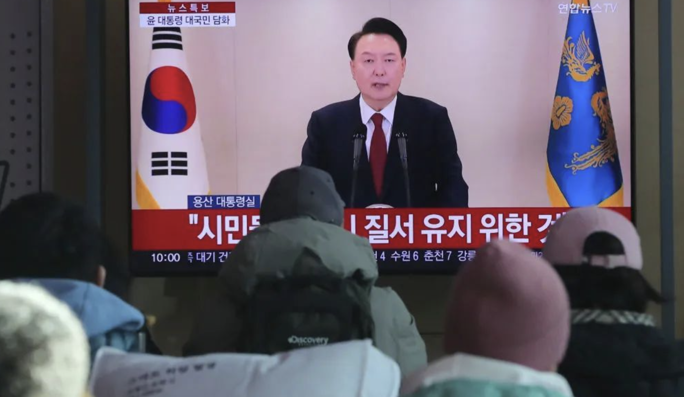 12月12日,在韩国首尔火车站,韩国民众观看总统尹锡悦对国民谈话的电视直播。新华社记者姚琪琳摄