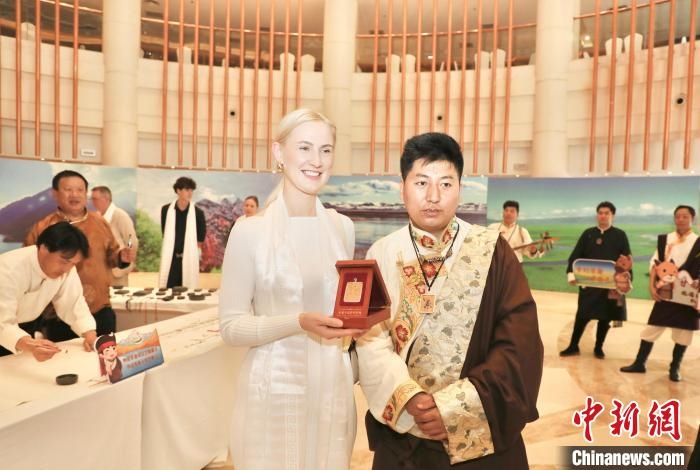 扎西当知布(右一)受邀参加,其个人绘制的微型唐卡受到外国嘉宾的喜爱。(受访者 供图)