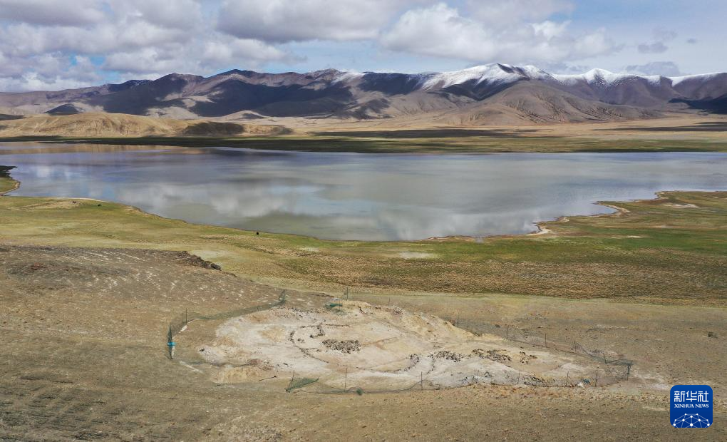 这是5月22日拍摄的坐落在玛不错湖畔的遗址第四期石构地面建筑考古发掘现场(无人机照片)。新华社记者 李贺 摄