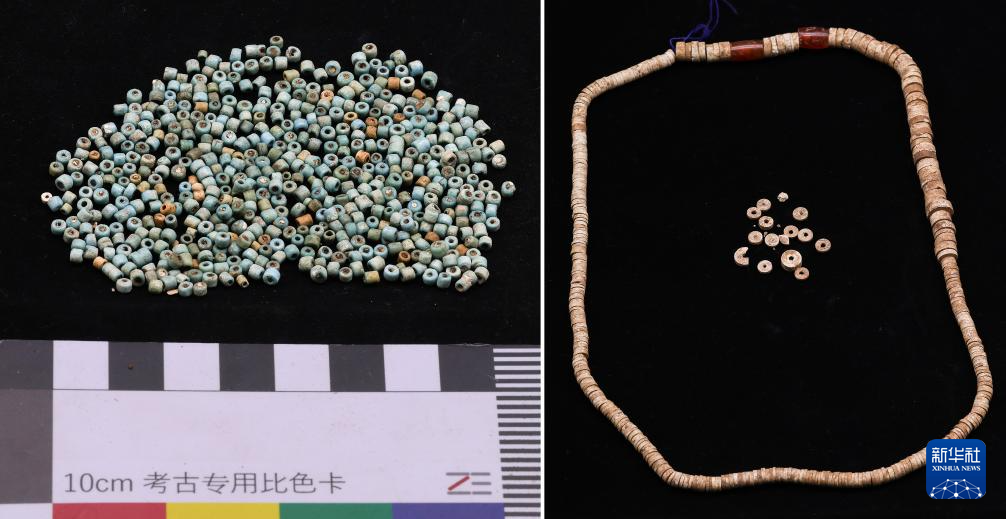 这是玛不错遗址出土的费昂斯珠(左)和带有红玉髓的滑石珠串(拼版照片)。新华社发(西藏自治区文物保护研究所供图)