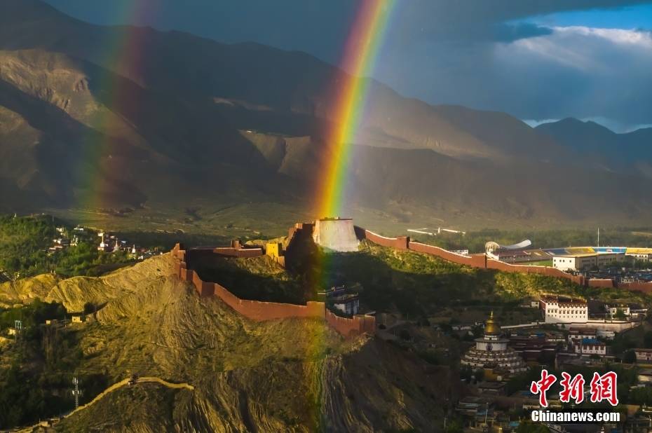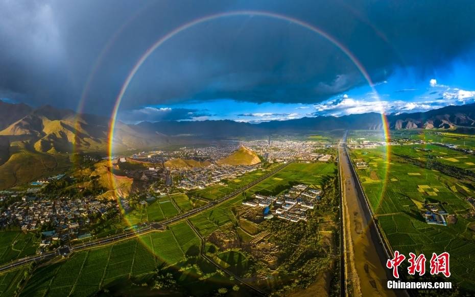7月9日,西藏日喀则市江孜县一场暴雨过后,出现圆形彩虹,光环下犹如打开了天空之门。
