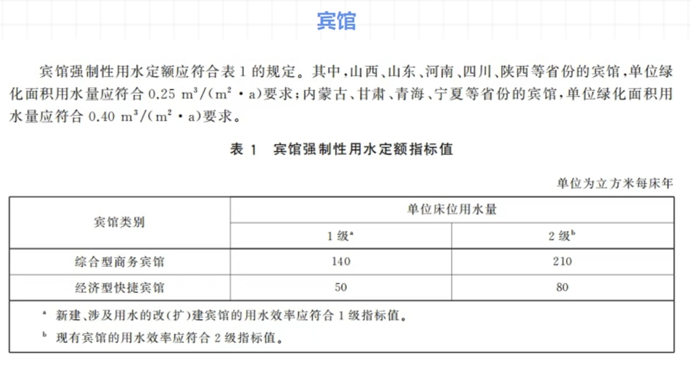宾馆强制性用水定额指标值
