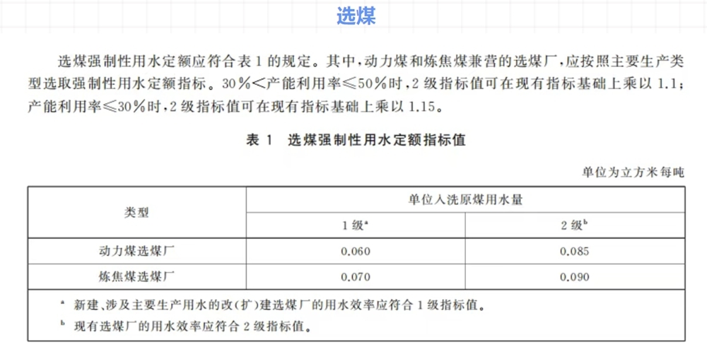 选煤强制性用水定额指标值
