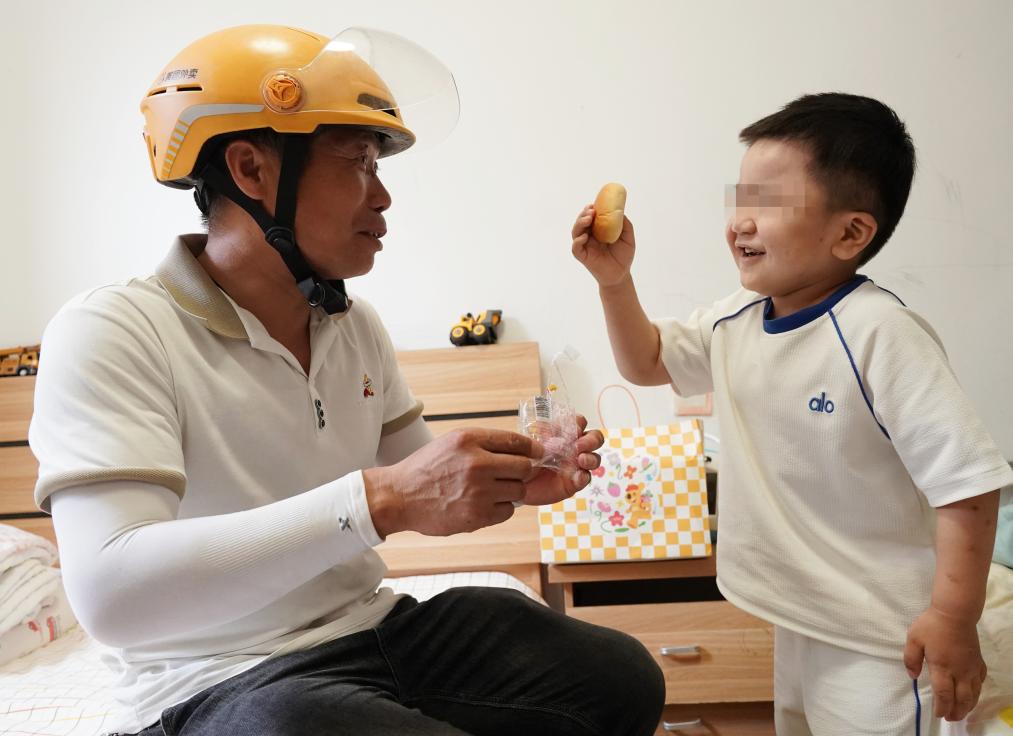 ↑7月22日,孟世祥在订单空闲时回家陪伴小儿子。