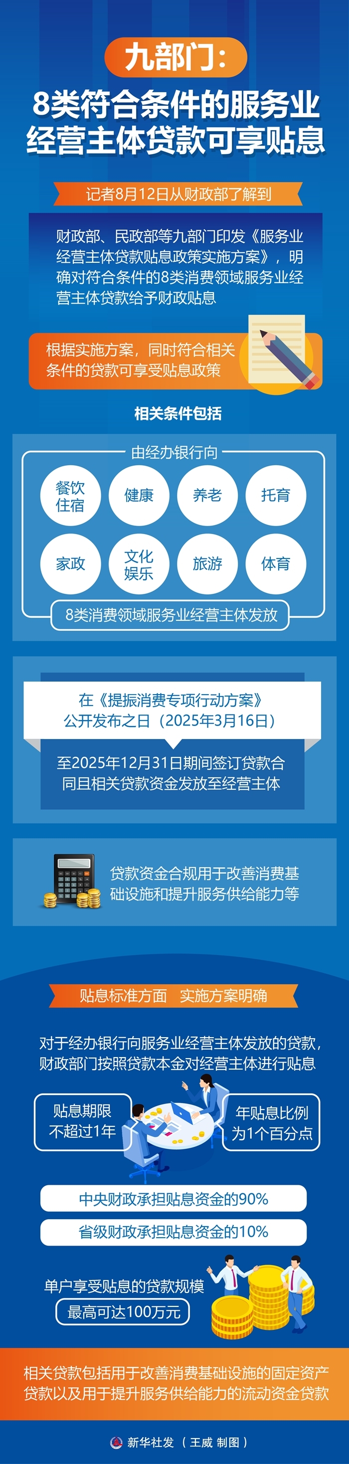 记者12日从财政部了解到,财政部、民政部等九部门印发《服务业经营主体贷款贴息政策实施方案》,明确对符合条件的8类消费领域服务业经营主体贷款给予财政贴息。