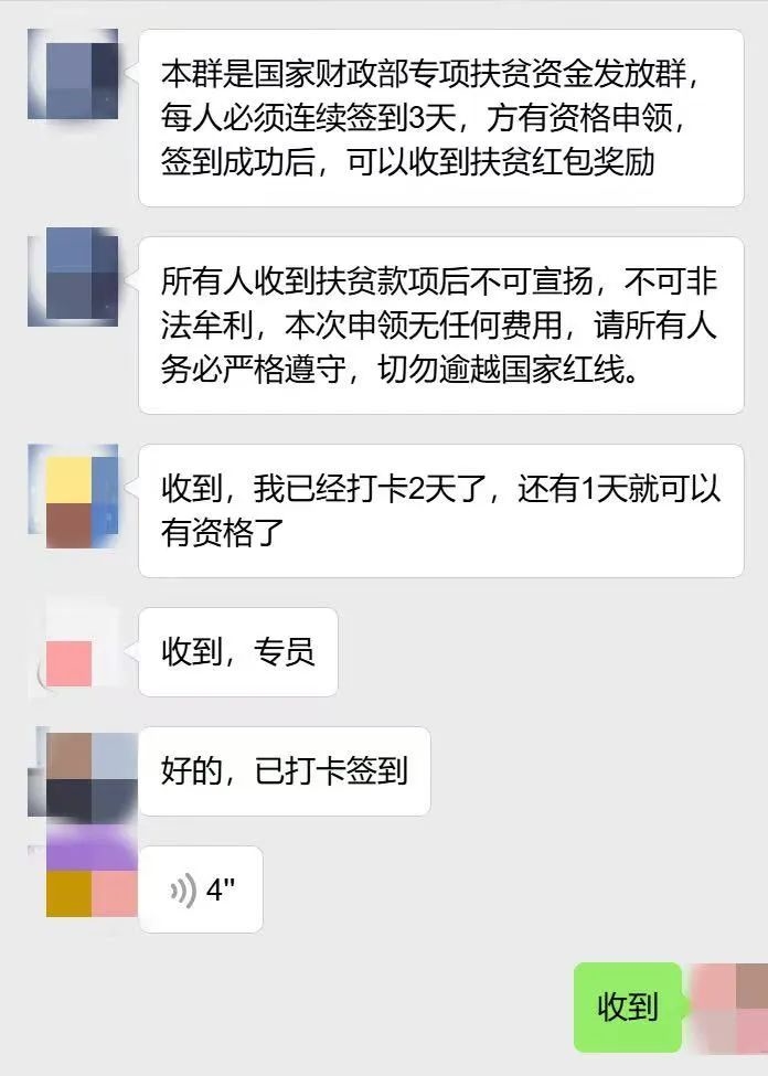 随后,该APP上的“在线客服”联系张婆婆,告知其要领取“扶贫资金”需要进入一个“共同富裕”的群,群里的“扶贫专员”会告知他如何申领。张婆婆进群后,“扶贫专员”在该群里发布群成员签到3天即可获得红包的通知,张婆婆签到3天后,支付宝账户也确实收到了50元红包,群里其他人也陆续发了签到获得红包的截图,这让张婆婆对领取“扶贫资金”更加深信不疑。