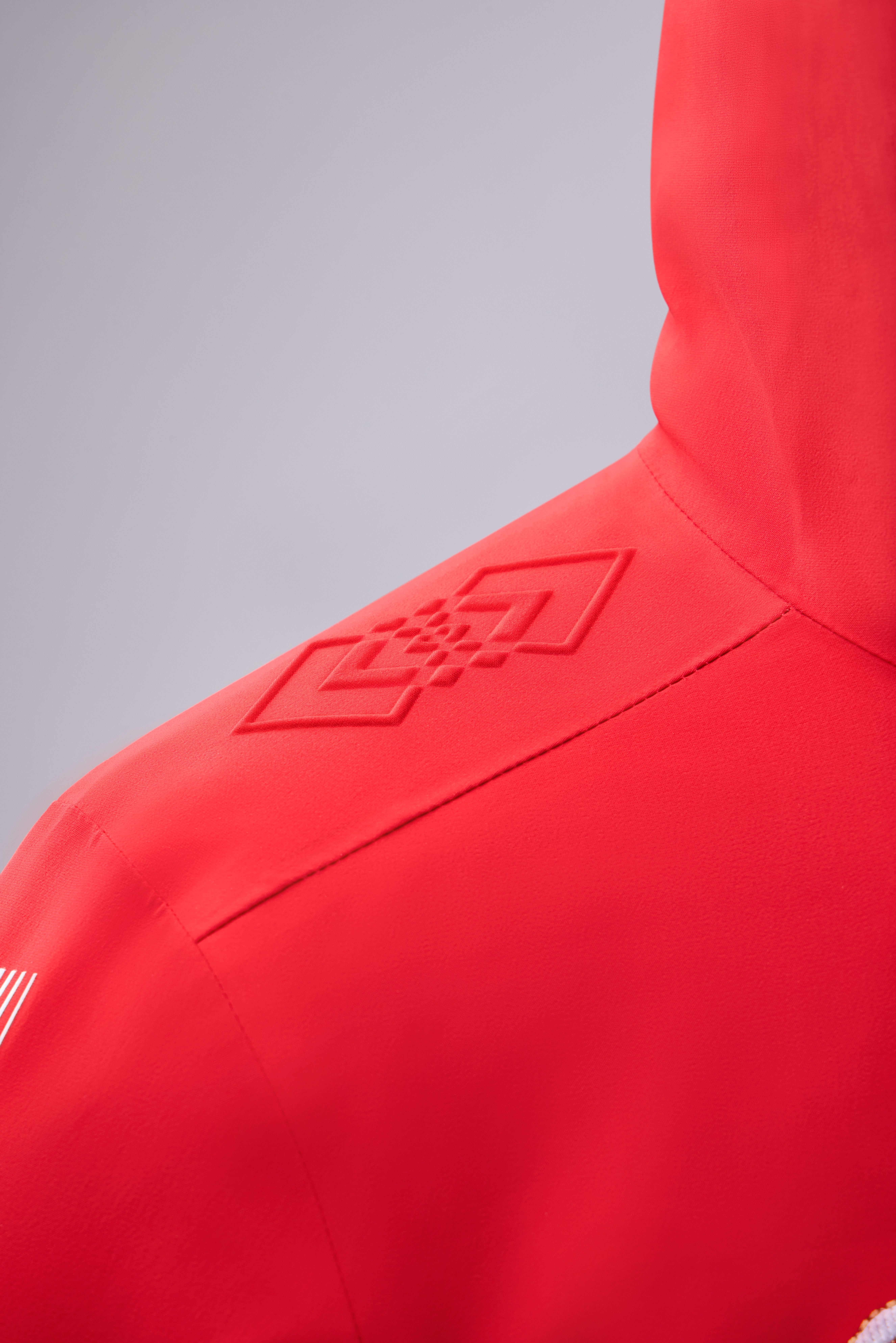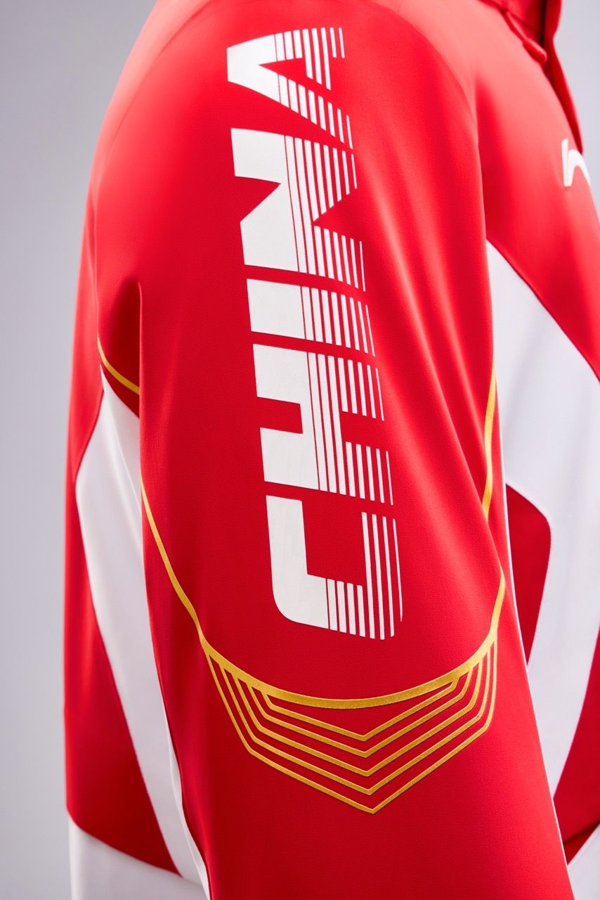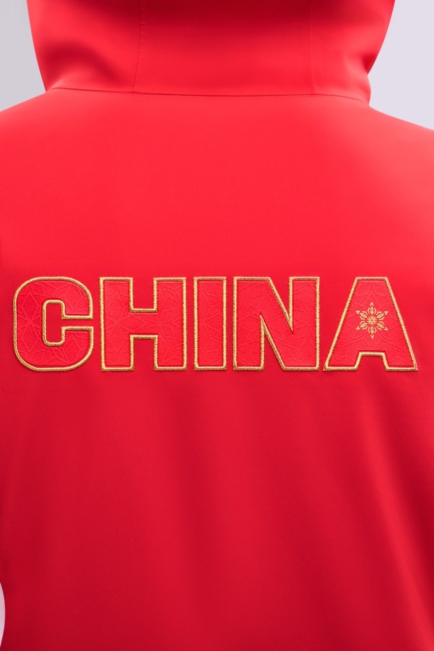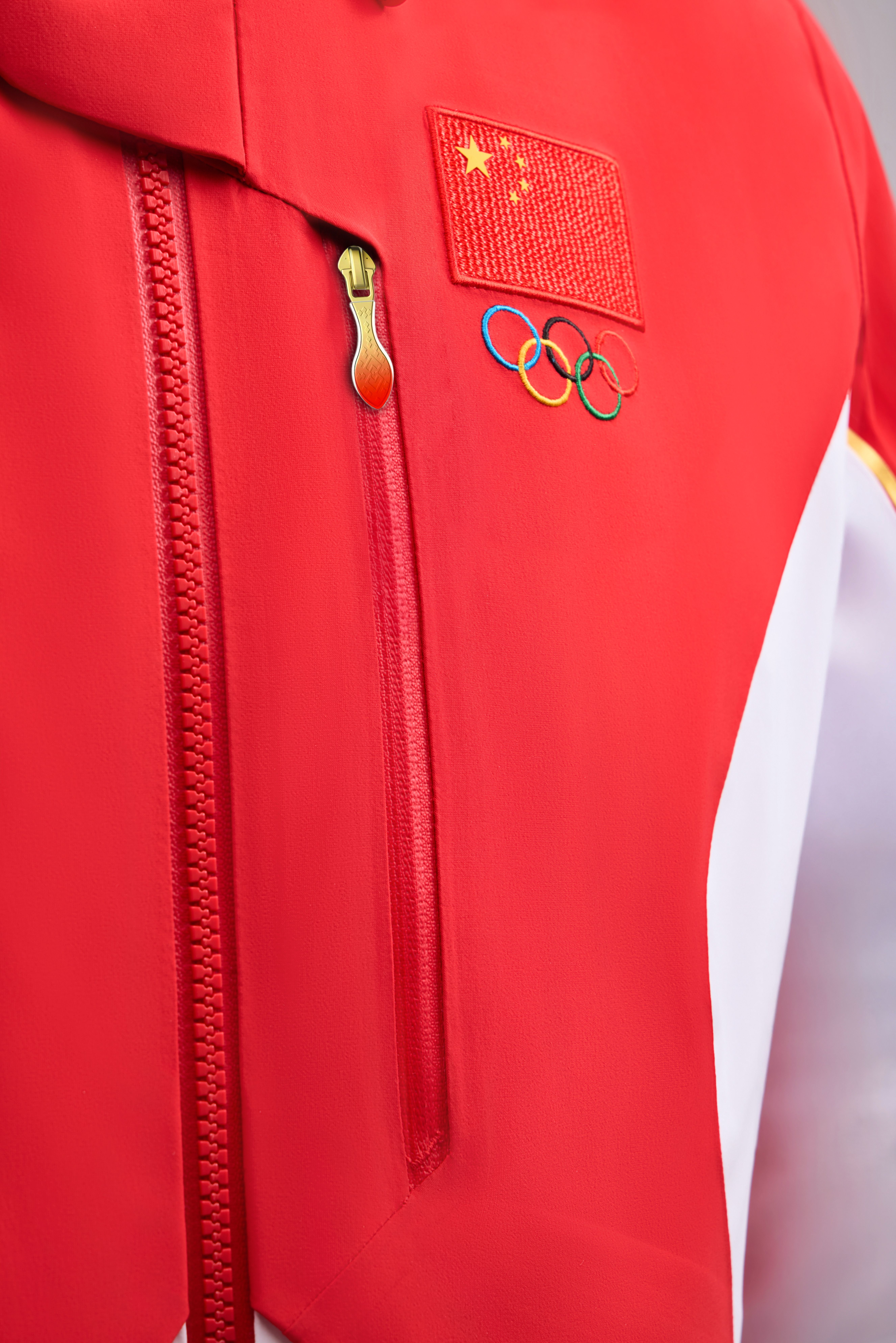 领奖服以红、白两色为主色调,“中国红”充分彰显中国文化元素,在正面勾勒出象征着五角星的线条;“雪山白”灵感源自冬季运动场景,也融入了东方审美里的留白意境,并在侧身搭配以雪道为原型的金色流线型线条为点缀,全身以上红下白的色彩拼接,凸显中国运动健儿的挺拔身姿。