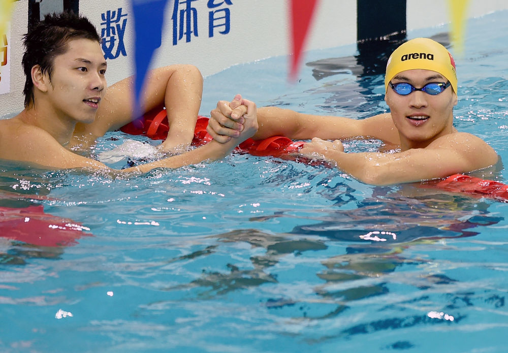 2013年9月6日,徐嘉余(右)在夺冠后庆祝。当日,在第十二届全国运动会游泳项目男子100米仰泳决赛中,浙江队徐嘉余以53秒43的成绩夺得冠军。新华社记者丁旭摄