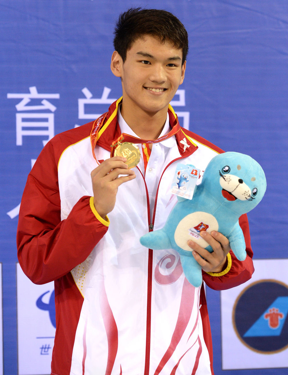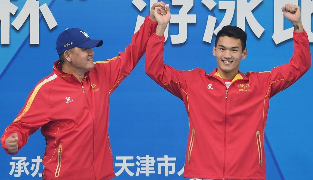 2017年9月2日,徐嘉余(右)与教练在颁奖仪式上。新华社记者 李响 摄