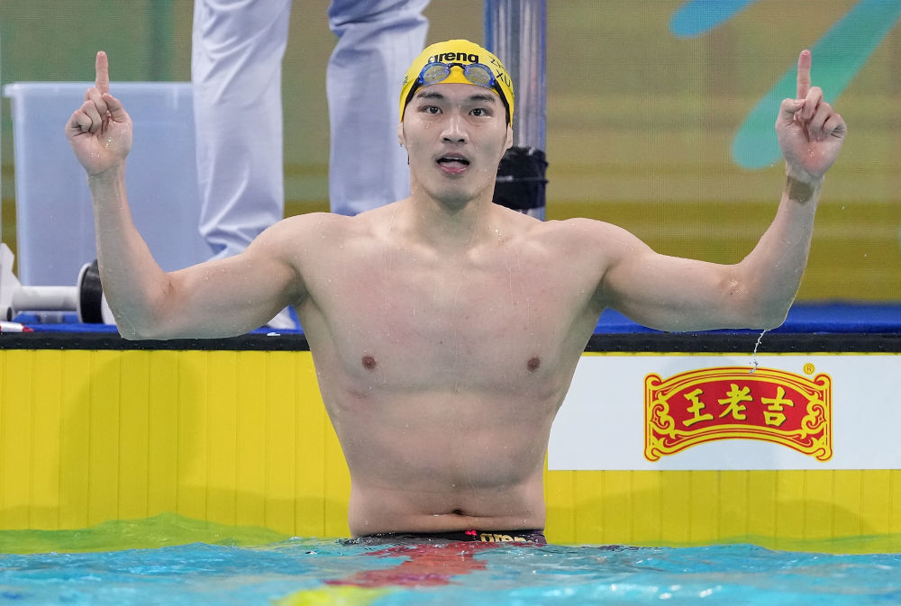2021年9月21日,冠军浙江队选手徐嘉余在比赛后。 当日,第十四届全国运动会游泳项目男子100米仰泳决赛在西安奥体中心游泳跳水馆举行。 新华社记者 雒圆 摄