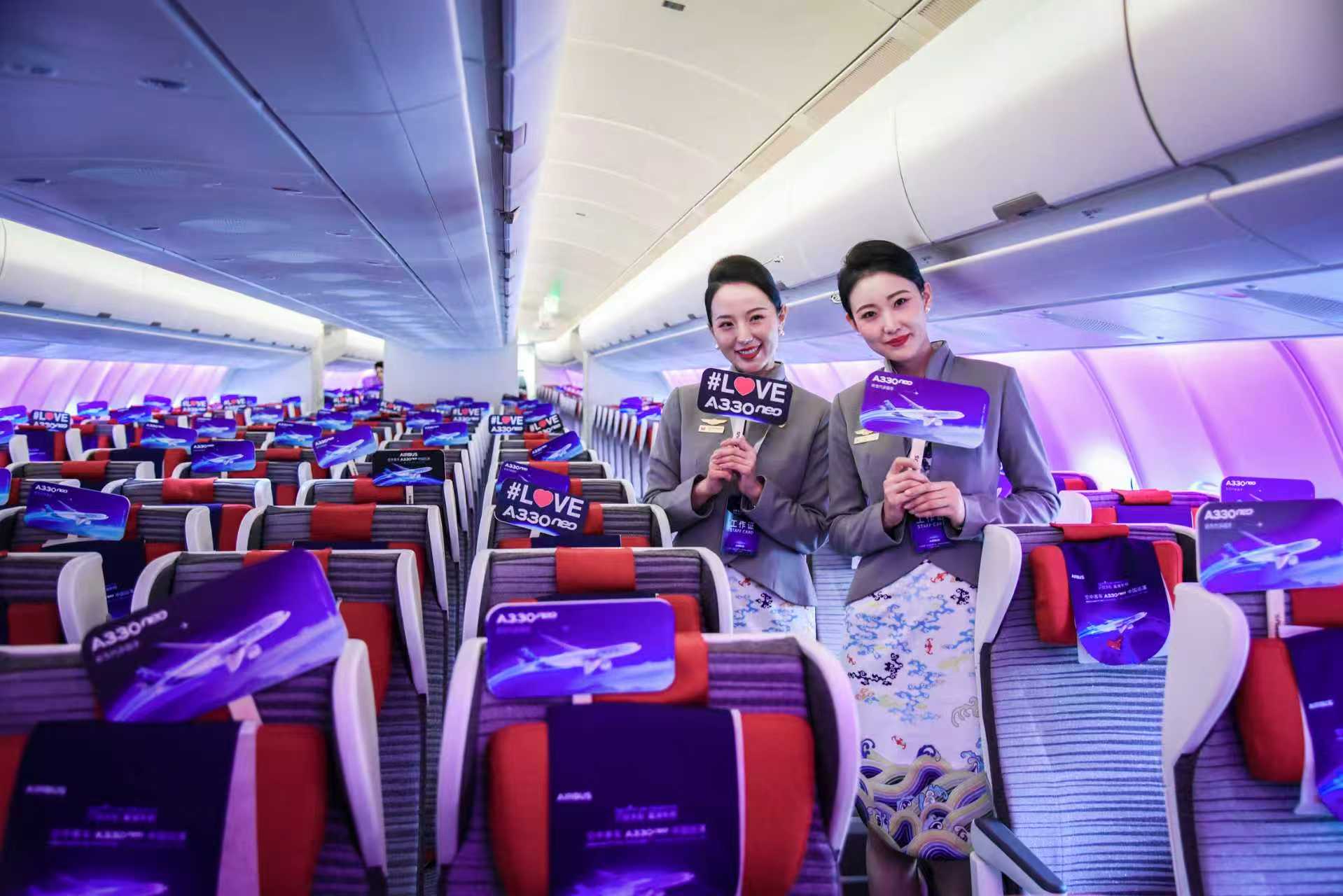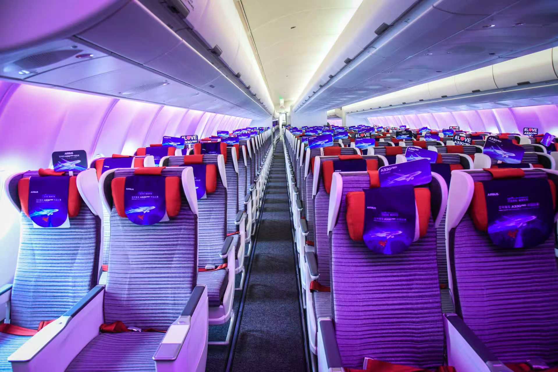 “空客A330neo配备了屡获殊荣的‘飞行空间’(Airspace)客舱,可为乘客提供独特的体验、高水平的舒适性、氛围和设计。”据空客中国市场部总经理黎存梅介绍,客舱的升级意味着乘客可以享受更多的个人空间、更大的头顶行李舱、全新的照明系统以及更新的机上娱乐和互联系统。