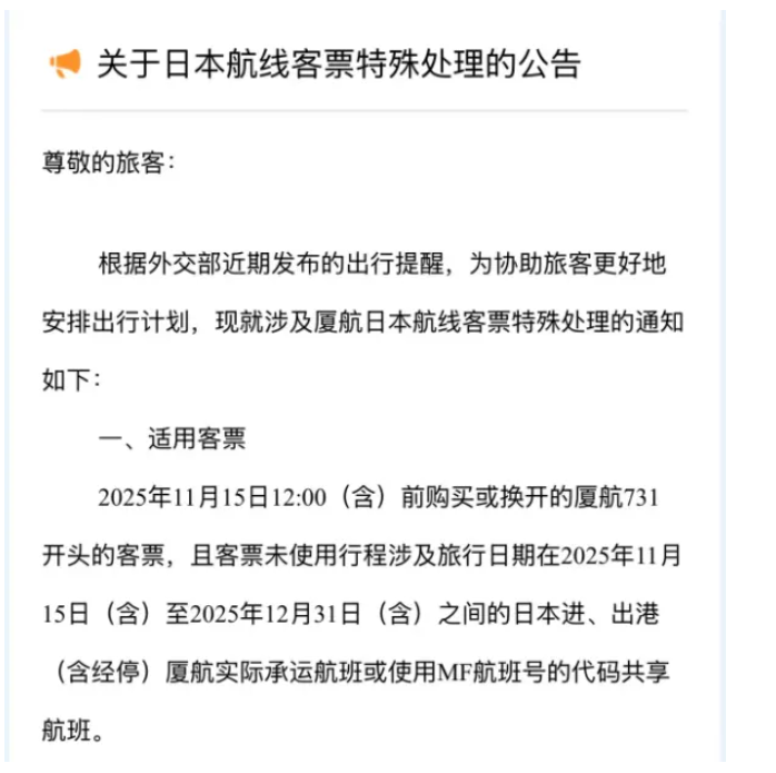 东航表示,对于在11月15日12:00(含)前购买或换开的东航781客票填开的国际、地区或国内航班。客票中至少含有一段未使用的涉及日本(包括但不限于东京、大阪、广岛、札幌、小松、鹿儿岛、长崎、新泻、冈山、福冈、静冈、名古屋、松山、冲绳、富山、熊本)进港、出港或经停航班(包括东航、上航或其他航空公司航班),航班起飞日期在2025年11月15日至2025年12月31日期间,同一客票内的其他未使用航段日期不限。办理变更至原航班前后3天(含)以内的航班,可免费变更一次。再次变更或变更超出原航班前后3天(含)内的航班,需依据客票使用条件办理。在客票有效期内,可至原购票渠道办理未使用航段非自愿退票,免收退票手续费。