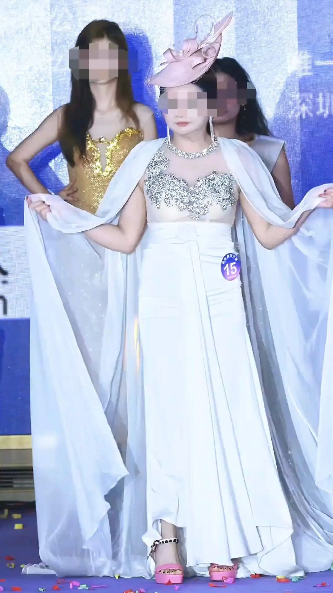 网络流传的相关视频显示,“国际模特大赛”15号女选手是一位看起来年龄偏大的女士,头戴桂冠、身披冠军绶带、手拿冠军证书,在强光下独自走上T台,向观众与评委致谢。她的体态丰腴,步伐略显拘谨,但脸上写满了自信和骄傲。