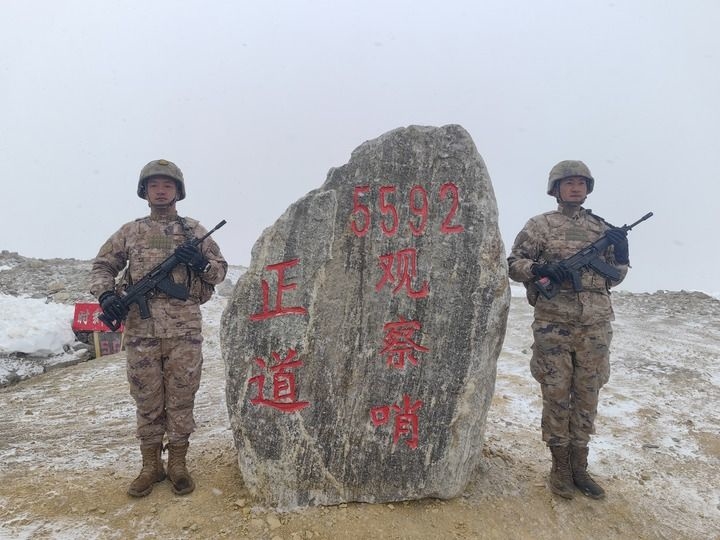 2月15日,西藏军区某边防团5592哨所官兵站岗执勤。新华社发(沈杰 摄)